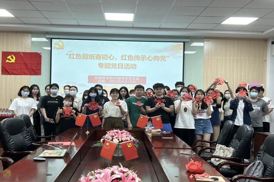 为深入开展学习贯彻习近平新时代中国特色社会主义思想主题教育,不断创新基层党建活动形式,5月19日晚,外国语学院20级学生党支部在第二行政楼308会议室开展了以“红色剪纸寄初心,红色传承心向党”为主题的党日活动,党支部书记蔡文蝶以及20级全体学生党员参加本次活动。
