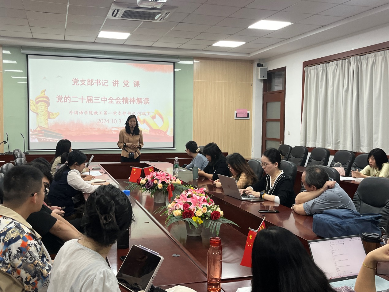 为深入学习宣传贯彻党的二十届三中全会精神,深刻领会和把握全面深化改革的重大成就、重大意义以及指导思想,10月31日,外国语学院教工第一党支部举行了以“党的二十届三中全会精神解读”为主题的书记讲党课活动。本次党课由党支部书记何瑞玉老师主讲。