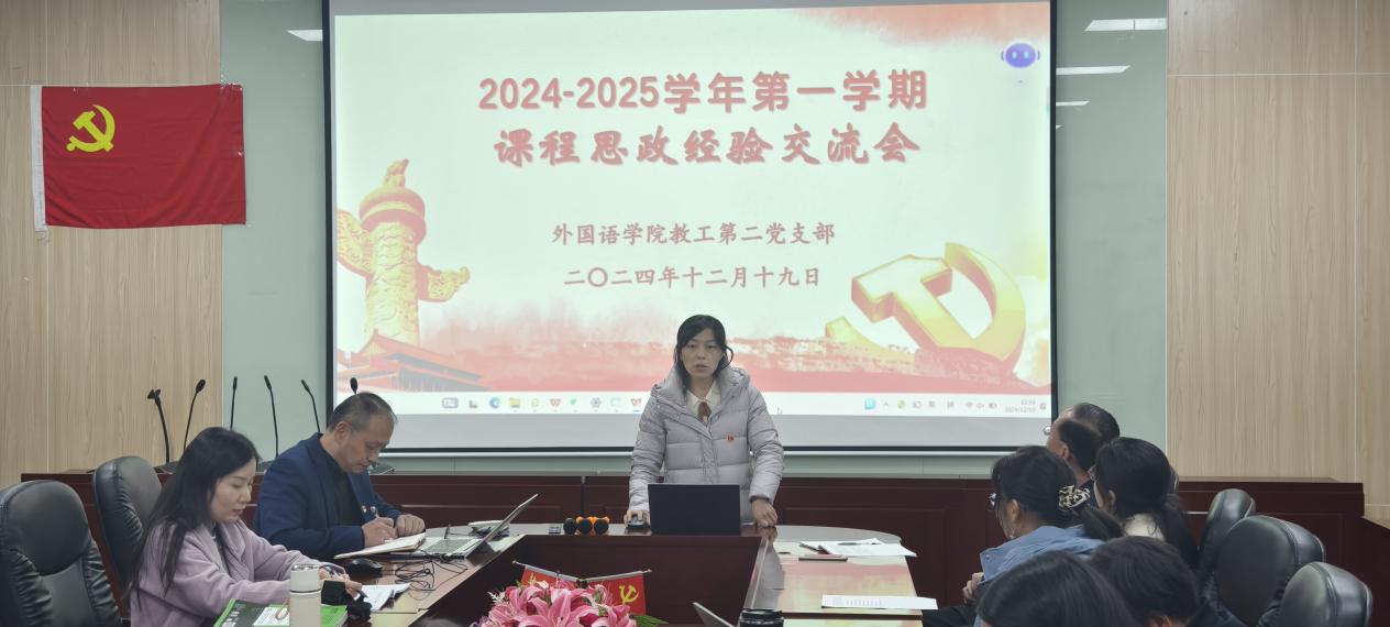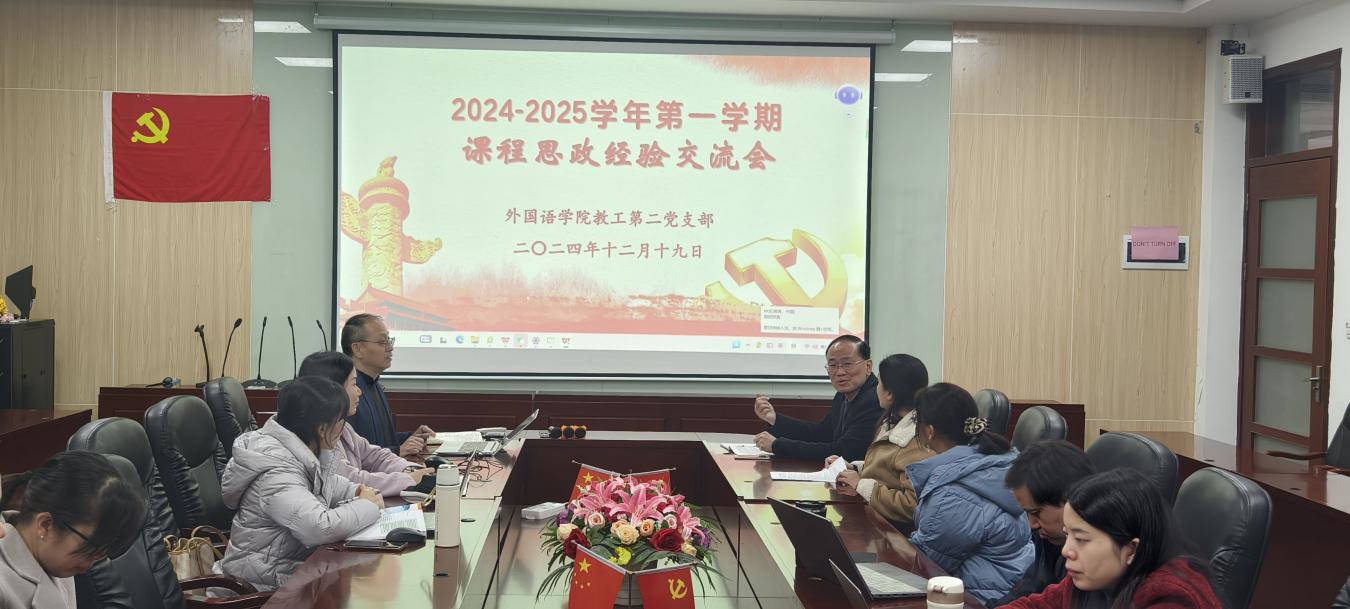 12月19日,外国语学院教工第二党支部于第二行政楼308室成功举办了课程思政经验交流会。会议由支部书记唐海民主持,麦影虹和范俊英两位老师作为主讲嘉宾,分享了她们在全国高校外语课程思政教学案例大赛中获得特等奖的课程案例设计经验。