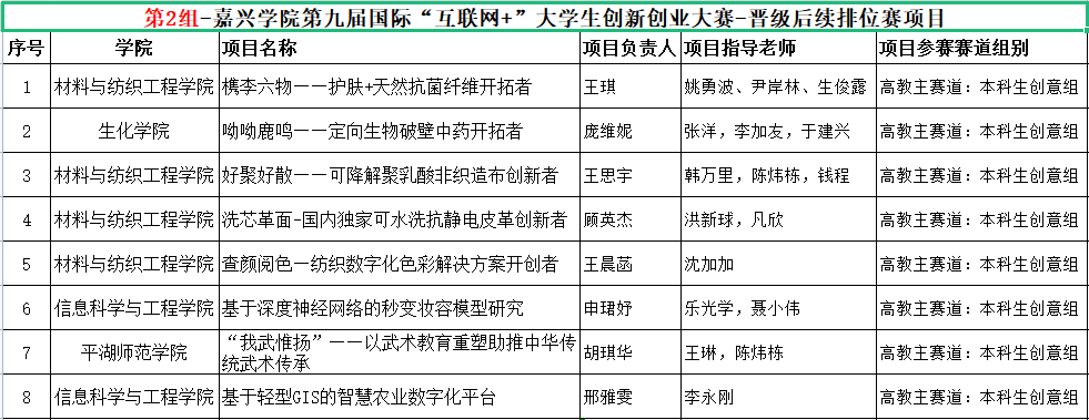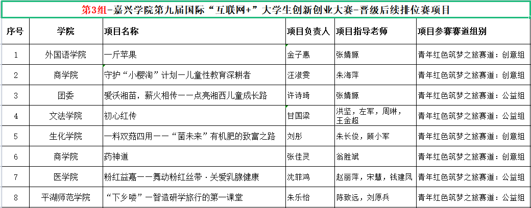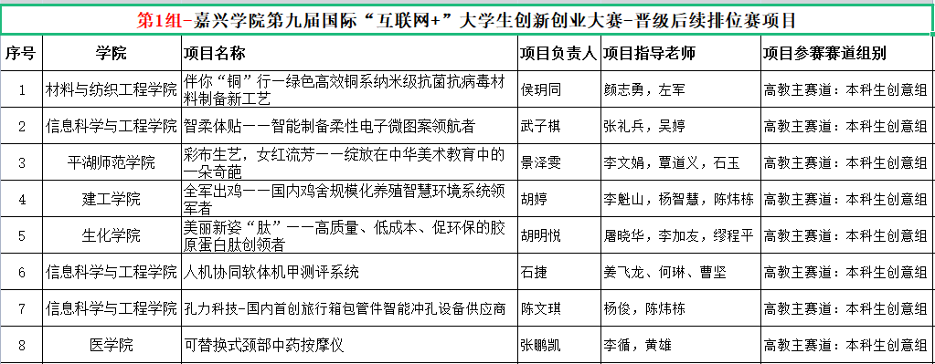 根据《关于举办嘉兴学院第九届“互联网+”大学生创新创业大赛暨第九届浙江省国际“互联网+”大学生创新创业大赛选拔赛的通知》要求,经路演、答辩、专家评审,《伴你“铜”行—绿色高效铜系纳米级抗菌抗病毒材料制备新工艺》等16个高教主赛道项目(不含国际参赛项目)、《一斤苹果》等8个“青年红色筑梦之旅”赛道项目,共24个项目晋级后续排位赛,特此公示。