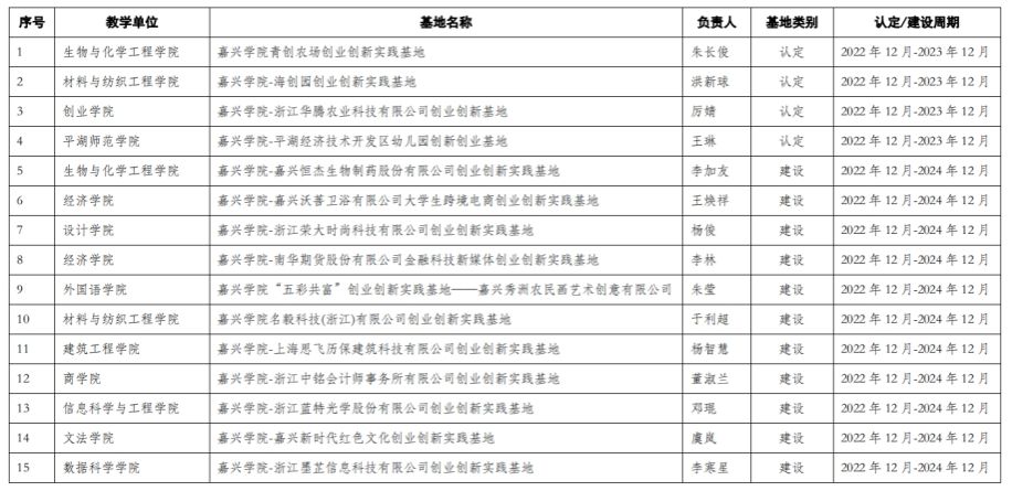 2022 年嘉兴学院大学生校外创业创新实践基地立项名单