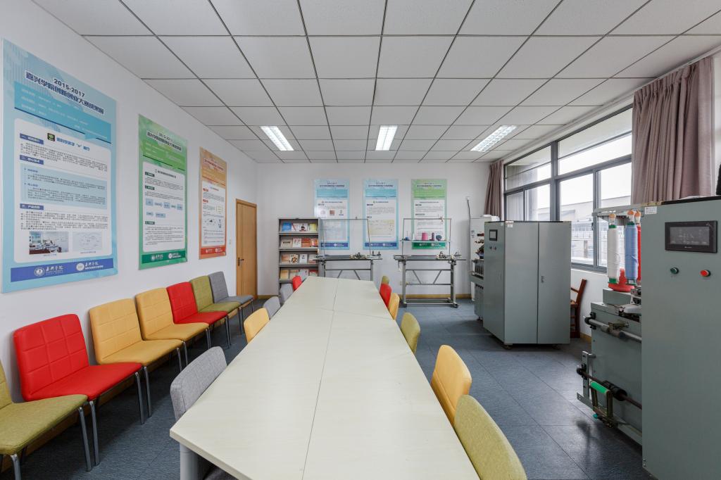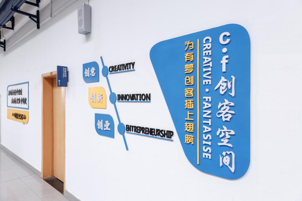 材纺学院c·f创客空间创建于2017年,现有场地40平方,可容纳20名学生同时办公。空间不断完善内部软硬件设施,如柜式空调、悬挂式电视机、可组合式桌椅、创业文化上墙和创新创业教育类的杂志期刊等,并且购置3D打印机、数码印花机等仪器设备方便师生使用。