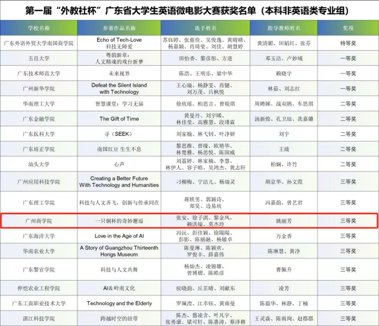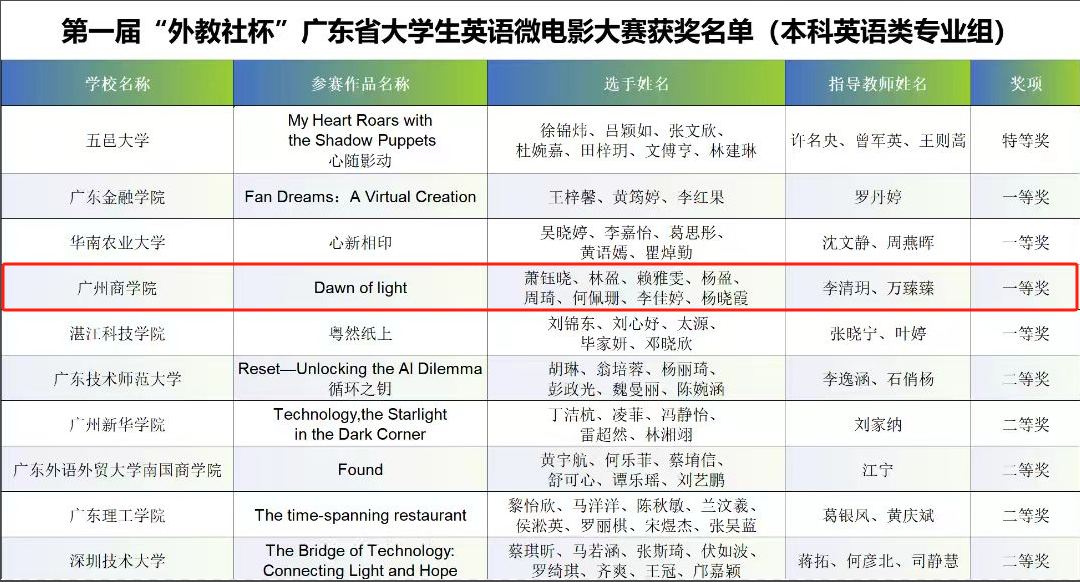 我校萧钰晓、林盈、赖雅雯、杨盈、周琦、何佩珊、李佳婷和杨晓霞8位同学,在外国语学院商务英语专任教师李清玥、万臻臻的悉心指导下,以其作品《Dawn of Light》荣获本科英语类专业组一等奖及最佳制作奖。该作品以细腻的叙事和出色的制作,充分体现了外院学子的卓越才华与创新精神。同时,由外国语学院大学英语专任教师姚丽芳指导,张安、徐子淇、黎金凤、赖洪镒、莫杰玲5位同学共同完成的作品《一只铜杯的奇妙邂逅》荣获本科非英语类专业组三等奖。该作品以独特的视角讲述了普通物件与人类情感之间的联系,展现了非英语专业学生在英语应用和跨文化交流方面的潜力与创意。