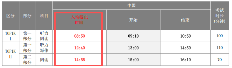 TOPIK II考生:中午11点35分开始可以入校,下午12点35分禁止进入考点,12点40分禁止进入考场