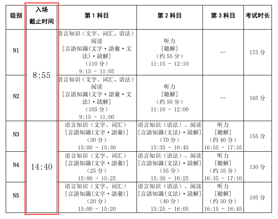 N3、N4、N5考生中午13点开始可以入校,下午14点35分禁止进入考点,14点40分禁止进入考场