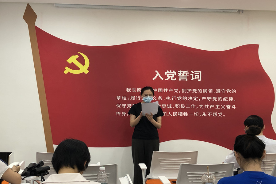 按照预备党员转正的组织发展程序,预备党员薛俊洁同志宣读转正申请书,汇报考察期内的个人思想、工作、学习及生活方面的情况。入党介绍人和与会党员充分讨论薛俊洁同志在考察期的综合表现并表明了态度。最后,经有表决权的正式党员无记名投票认为,薛俊洁同志已经具备一名合格党员的政治素养和条件,同意其按期转正,并形成决议报上级党委审批。会后,新党员和全体支部党员在外国语学院党总支书记徐超的带领下,面对党旗庄严宣誓。
