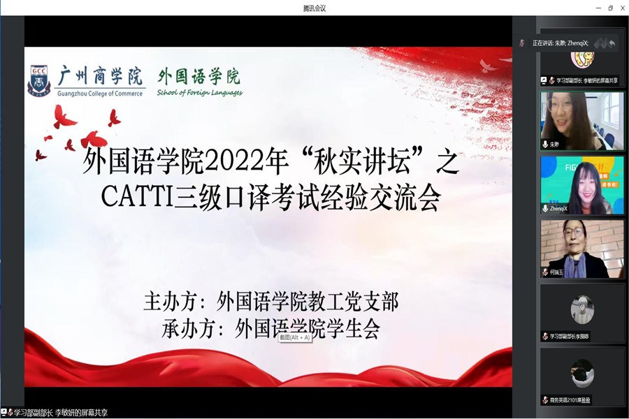 为进一步增强教工党员的志愿服务意识和能力,加强学生学业指导,外国语学院教工党支部与院学生会学习部于12月2日19:00,在线上腾讯会议开展了外国语学院2022年“秋实讲坛”之CATTI三级口译考试经验交流会。出席本次会议的领导嘉宾有外国语学院教工第一党支部书记何瑞玉、外国语学院专任教师朱渺、外国语学院专任教师张珊、商务口译课程主讲教师徐溱圻。