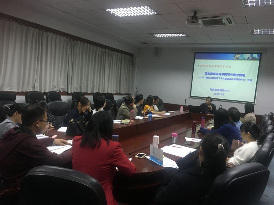 3月5日下午,外国语学院在第二行政楼308会议室举办第55期商务英语学术沙龙。本期沙龙由商务英语学科带头人曾利沙教授主持,主题为“国家课题申请书撰写与修改要略”。外国语学院袁鑫副院长、龙海英副院长和商务英语系全体教师出席了沙龙研讨。