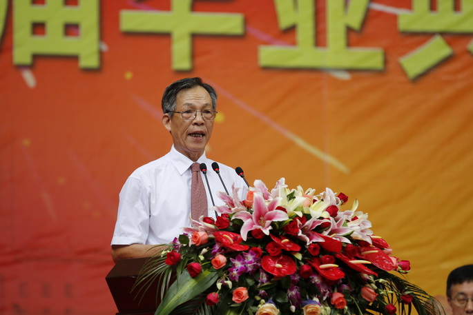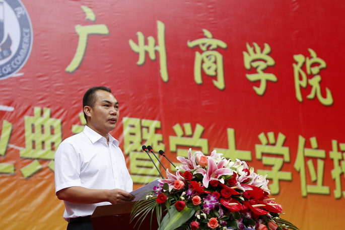 典礼开始,全场奏唱国歌。学院院长杨文轩教授首先致辞。他指出,今天的毕业典礼意义非凡,今年的毕业生是华南师范大学增城学院的毕业生,又是广州商学院成立后的第一届毕业生。四年来,同学们见证了学院的变化与发展。他与同学们一起回顾四年大学生活的苦与乐,也回应了关于“舌尖上增院”的幽默调侃,又从一个从事教育工作四十年的老教育家的角度勉励同学。