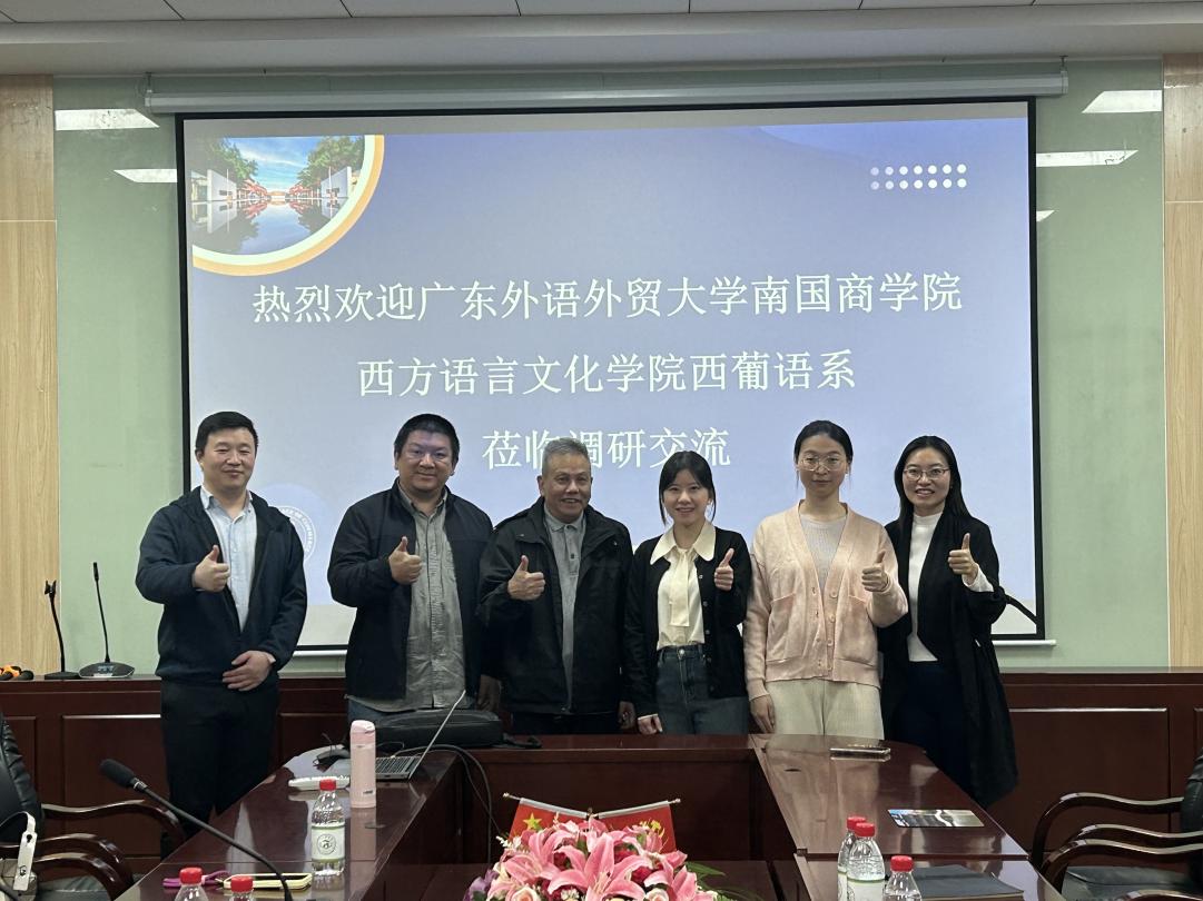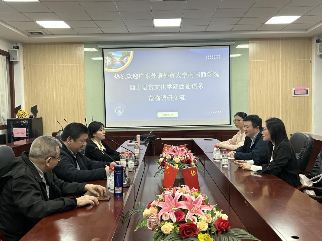 12月4日上午,由广东外语外贸大学南国商学院(简称“广外南国”)西方语言文化学院西葡语系(简称“西语系”)系主任朱学文、副主任杨帆、专任教师李翔一行三人莅临广州商学院外国语学院西班牙语系(简称“我系”)进行访问,本次交流活动就人才培养、课程建设、专业建设、师资队伍建设、学科建设和社会服务等工作进行深入的探讨与交流,交流会在第二行政楼308 举行,外国语学院西班牙语系主任邝美琳、专任教师廖运、专任教师冉梨蕾、专任教师葛灵子出席会议。