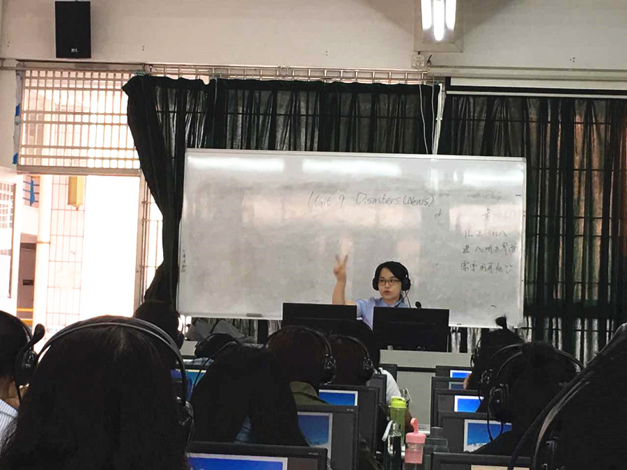 本次课的主要内容是课本第九单元有关灾难的新闻学习,黄丹凤老师在导入部分先讲述了发生在家乡的一些自然灾害,由此自然地引出话题,并带领学生学习与话题相关的生词和短语;再通过PPT简明扼要地呈现了本堂课的教学目标和教学内容。在课堂教学中,黄老师介绍了新闻材料的倒三角型特点,并采用基于问题的探索型教学模式,将问题明确呈现给学生,让学生带着问题和目标去听新闻材料,在解析时,详细讲解了抓细节信息的技巧和一些近音词的辩音。在学生已经了解了新闻内容的基础上,让学生再听材料,抓主干信息并对主干信息进行梳理记录。接着黄老师引导学生开始引导学生进行自主训练,让学生听音跟读,进行“影子练习”,此举能有效锻炼学生的短时记忆能力。通过影子练习,学生们已对新闻材料的内容非常熟悉,基于此黄老师让学生根据所记录的主干信息对新闻内容进行复述,在大约3分钟的准备后,学生们踊跃表现,几乎都能自如地将主要信息复述。最后一个环节是让学生自行设计问题,并互相提问。整堂课由导入到最后的问题设计一气呵成,既有导入环节的情景铺垫,又有听力训练的细致解析,既充分调动了学生的自主学习能力,又充分发挥了老师的引导性学习效应。黄老师全程英文教学,语音标准,教态自然,由易到难循序渐进的带领学生去寻找打开英语新闻世界的钥匙。