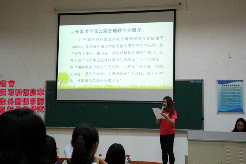“外国语学院公寓管理联合会以‘为学生创造良好学习生活环境’为工作理念,‘为同学创建和谐宿舍文化氛围’为实践追求,”坚实有力的话语是公管会主任李晨阳对同学们的承诺,李晨阳的讲话让同学们充分认识了公管会的精神。在今后的日子里,我院公管会也将秉承这种精神,继续服务同学、团结同学。