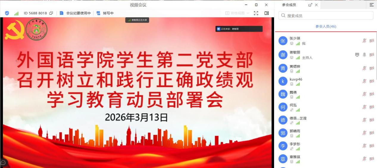 3月12日,外国语学院学生第二党支部召开树立和践行正确政绩观学习教育动员部署会,深入学习贯彻相关精神,统筹推进学习教育走深走实。党支部书记谢敏丽主持会议并作动员部署,组织委员李思浩、宣传委员庄菲菲、教师党员陈钰洵以及支部全体学生党员参加会议。