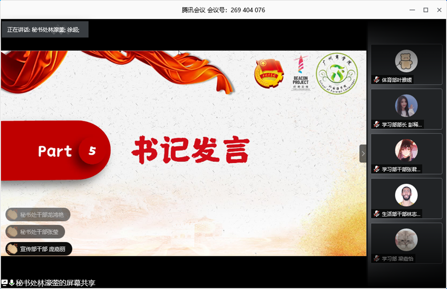 为深入学习宣传贯彻全国两会精神,引导我院学生干部深刻领会两会的核心要义,同时展现我院学生干部不忘初心做好本职工作的精神面貌,确保学生工作的有序开展,我院学生会于5月31日15:00在腾讯会议平台上举行以“学习践行两会精神,外院学子在行动”为主题的学习会暨5月工作总结会议,出席本次会议的有学院党总支书记徐超,学院学生会指导老师伍思颖以及学院学生会全体干部。