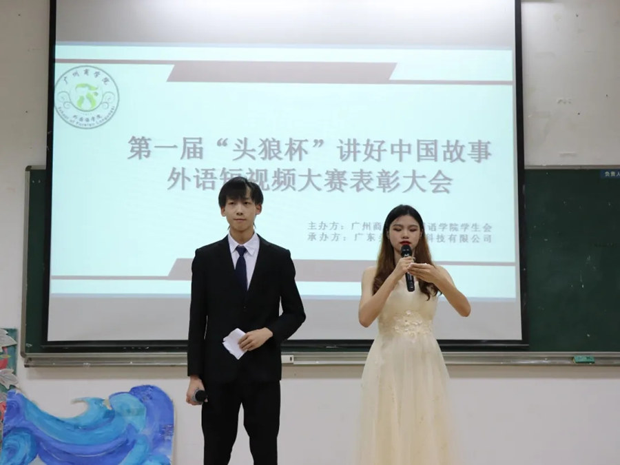 为积极响应国家“讲好中国故事,提升文化传播”的号召,进一步推进学院学风建设活动,广州商学院外国语学院与广东头狼教育科技有限公司合作举办了第一届“头狼杯”讲好中国故事外语短视频大赛。为了给予参赛者肯定,并对他们的优秀作品进行表彰。外国语学院教工党支部及外国语学院学生会于2021年6月17日19点在四教第二报告厅开展了外国语学院2021年第一届“头狼杯”“讲好中国故事”外语短视频大赛表彰暨分享会。
