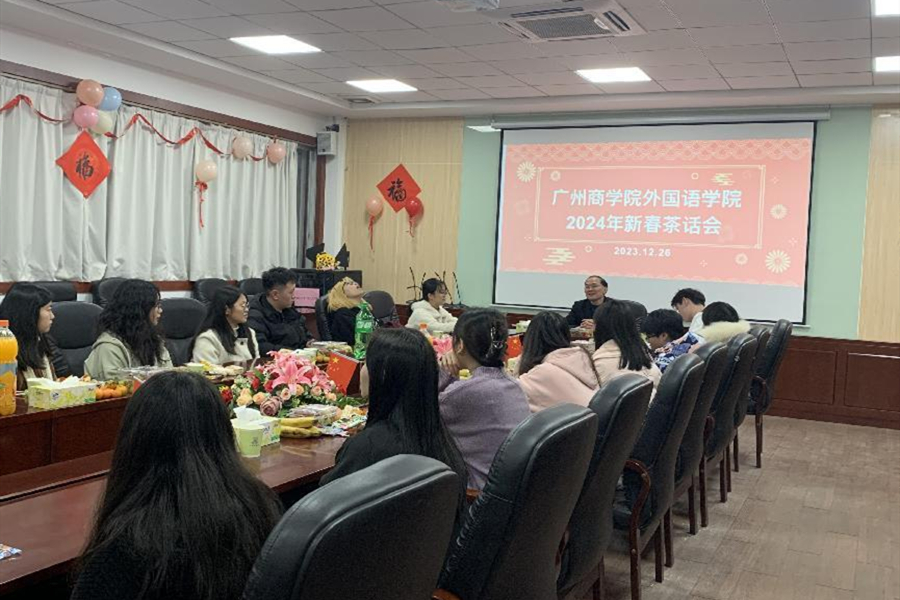 为加强学院与学生之间的联系,增进朋辈交流,关注学生成长,外国语学院于12月26日20:00在第二行政楼308室开展2024年新春茶话会活动。出席本次活动的有外国语学院党总支书记徐超、外国语学院22级辅导员谢敏丽以及各年级、各专业部分学生代表。