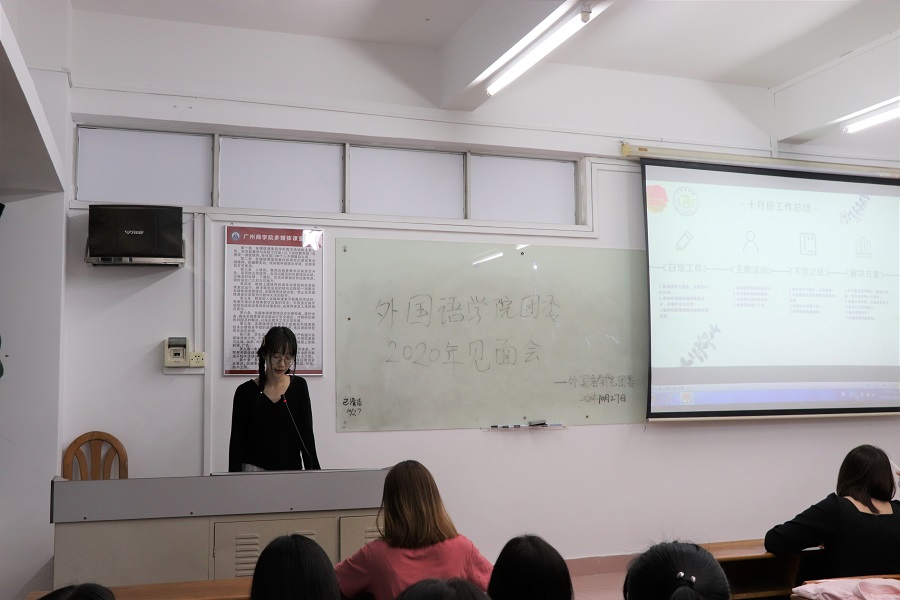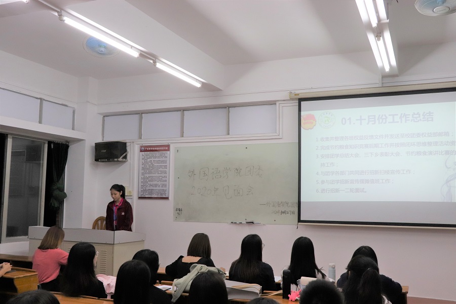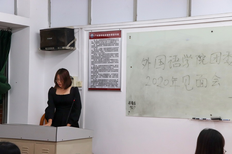 会议伊始,各部门部长对十月份工作总结及十一月份工作计划进行详细汇报,并总结经验提出改进方案。接着,各部门部长依次介绍本部门新加入的固定志愿者,充满干劲的志愿者们为初次的见面准备了精彩的才艺展示。随后,团委副书记姚焕雯对新一届固定志愿者们表示热烈欢迎,并对团委固定志愿者提出三点期望:第一,在日常生活中要礼貌得体,时刻注意自己行为举止;第二,团委与学生会都是外国语学院重要的组成部分,共同致力于为学生服务。作为团委的一份子,要学会与各部门互帮互助互进;第三,要平衡学习与工作之间的关系,学会兼顾学业的同时不忘自己的工作职责。最后,由外国语学院团委书记赖雯慧作总结讲话。她首先对固定志愿者们表示欢迎和肯定,希望通过本次会议可让固定志愿者们明确各部门职责以及促进部门间的认识沟通,同时她强调作为固定志愿者应具有主动担当、荣辱与共、团队精神的优秀品质。赖雯慧老师衷心希望团委各部门的成员对未来做好准备,并以严格的要求不断提升自己能力,相信在接下来的一年里有所成长与收获。