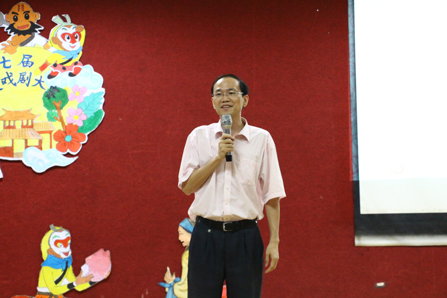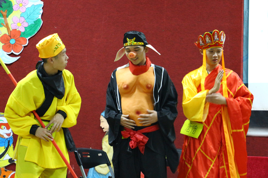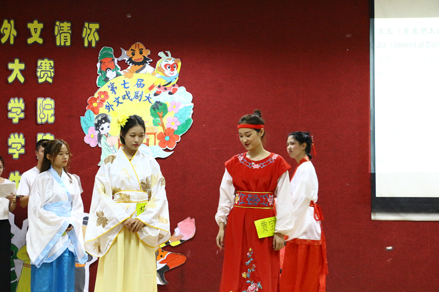 大赛伊始,广东尚睿网络技术有限公司代表陈伟东先生上台致辞。他感慨恰同学少年,风华正茂。人生如戏,对各剧团表现满怀期待。本次比赛以中华三大名著为演绎剧本,各参赛剧团遴选名著中章节创造表演。日文剧《三国演义》,节选了华容道义释曹操篇章,情节跌宕起伏,一处处埋伏拦阻曹操去路,残兵败将只得落荒而逃。穿插其中的动作戏更是使紧张的气氛蔓延全场,扣人心弦,博得观众的阵阵掌声;英文剧《西游记》演绎的是四圣试禅心篇章,唐僧四人西天取经,路过富贵人家,本想借宿一夜,未曾想这是万险千辛中的一场考验。其中八戒娶妻片段更是让整个演厅笑声不断;最后英文剧《红楼梦》,呈现的是古今共梦尽荒唐篇章,通过其独特的情节构思设计,深刻地演绎出了一段凄凉又唯美的爱情故事,也为本次外文戏剧大赛画上了一个完美的句号。比赛结束,徐超为活动做总结发言,他给各剧团的表现给与了高度的肯定和赞扬,他认为此次比赛作为外国语学院的品牌校园文化活动之一,既丰富了校园生活,也为外院学子提供了锻炼“听说演译”的极佳平台。经过评委打分和大众评委投票,最后由西游总动员剧组荣获本冠军和最受欢迎奖,红楼梦剧组、三国演义剧组分别荣获亚军、季军。