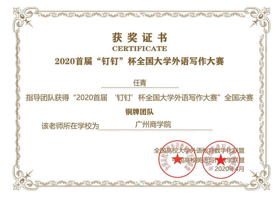 2020年3月-5月,首届“钉钉”杯全国大学外语写作大赛在线上拉开战幕,全国600所高校3000多支高等院校团队近30万名学生进行了激烈角逐。在指导老师和参赛学生的共同努力下,我校1个团队获得团队铜奖,1名学生获得个人二等奖,6名老师获优秀指导教师奖,1名老师获得指导教师组织奖。