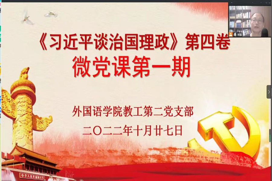 10月27日晚,为深入学习宣传贯彻《习近平谈治国理政》第四卷,外国语学院教工第二党支部线上微党课活动正式开课。活动本着“支委带头,全员参与”的原则,旨在通过让每一位党员讲党课,引导全体党员准确把握《习近平谈治国理政》第四卷的核心要义、精神实质、丰富内涵和实践要求。本次微党课活动共四期,每一期由四至五名党员宣讲,每名党员宣讲一至两个专题。第一期由本届和上届支委会成员唐海民、范俊英、姚丽芳、潘文晗等老师主讲。