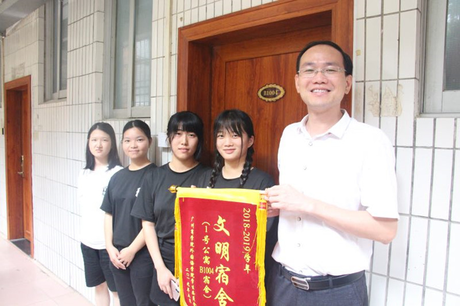 发言结束后,徐超书记为1栋B1001、1栋B1004以及1栋B1007三间“文明宿舍”代表颁发锦旗,并与全体在场人员合影留念。随后,徐超书记深入宿舍,亲自为获得“文明宿舍”称号的宿舍挂旗,并与宿舍成员进行深入交流,了解同学们在学习、生活中的情况。