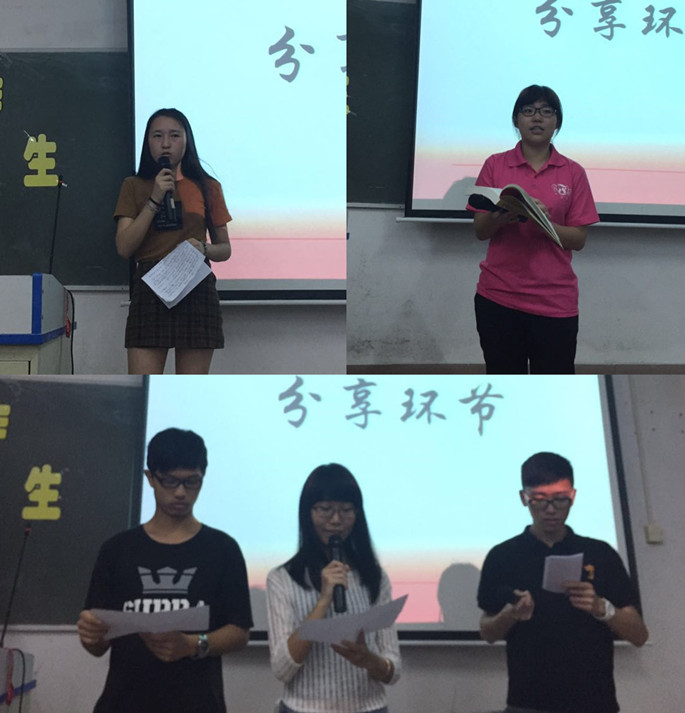 学习活动开始,徐超书记从“为什么读书、怎么读书、读什么书”三方面发表动员讲话,他鼓励学生干部要多读书、会读书、读好书。随后,干部们纷纷上台分享自己喜欢的书籍或是读过的书,团委干部杨雪菲分享了余华的作品《第七天》,她分享道,书中的社会现象见闻,揭露了社会人生百态,让现实中的我们更需要努力奋斗。学生会学习部和体育部干部以朗诵的方式,分享了席慕蓉的作品《青春》和徐志摩的作品《再别康桥》,学生干部再次体会了诗歌的优雅和魅力;学生干部黄琼瑶分享了东野圭吾的梦幻小说《解忧杂货店》。另外,黄玉亭老师分享了书籍《像狗一样奔跑》,她鼓励同学们坚持梦想,努力奔跑。分享会的现场气氛非常热烈。文学、小说、诗歌,分享作品应有尽有,学生干部们在分享的海洋中,慢慢体会了读书的魅力。
