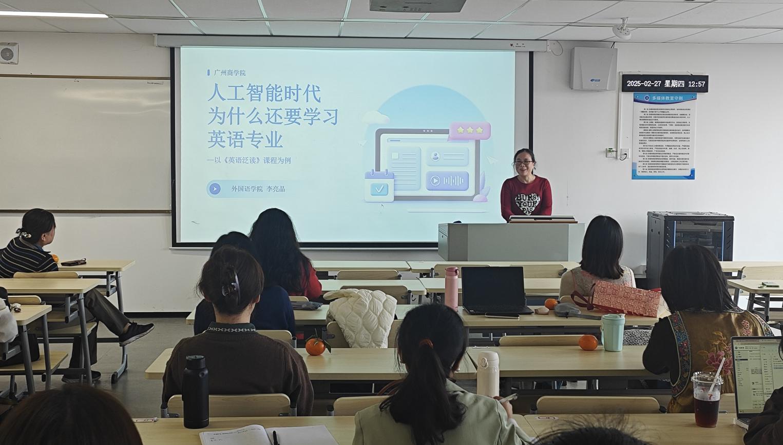 紧接着,李亮晶老师以《英语泛读》课程为例,探讨了人工智能时代英语专业的结构危机与改革趋势。她指出,当前学生过度依赖AI完成阅读理解、摘要写作等任务,AI的滥用导致英语专业存废争议四起。为此,她提出了升级教学模式、建设课程群、创新课程评价方式等改革措施,旨在激发学生的学习兴趣,提升他们的自主学习能力与批判性思维能力。