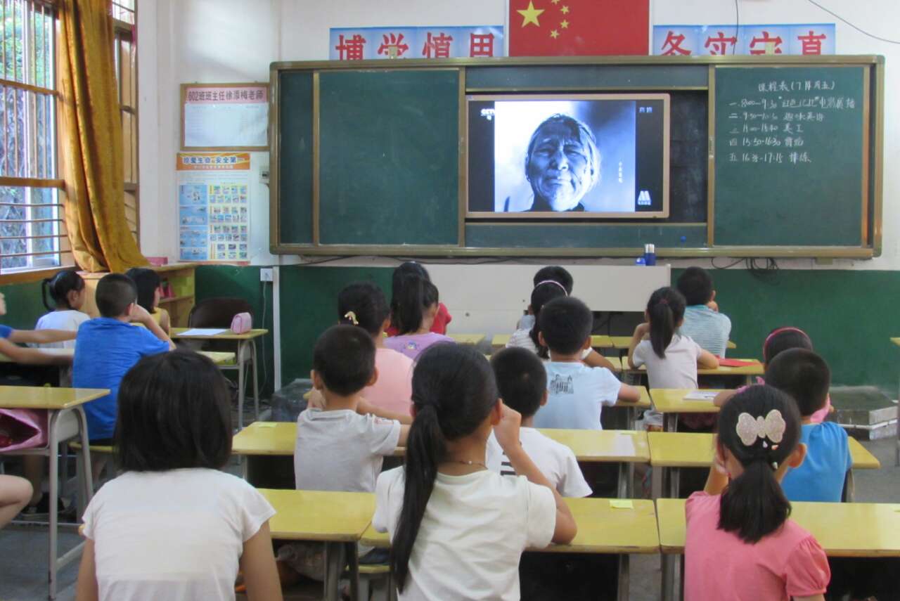 同学们聚精会神地看着电影