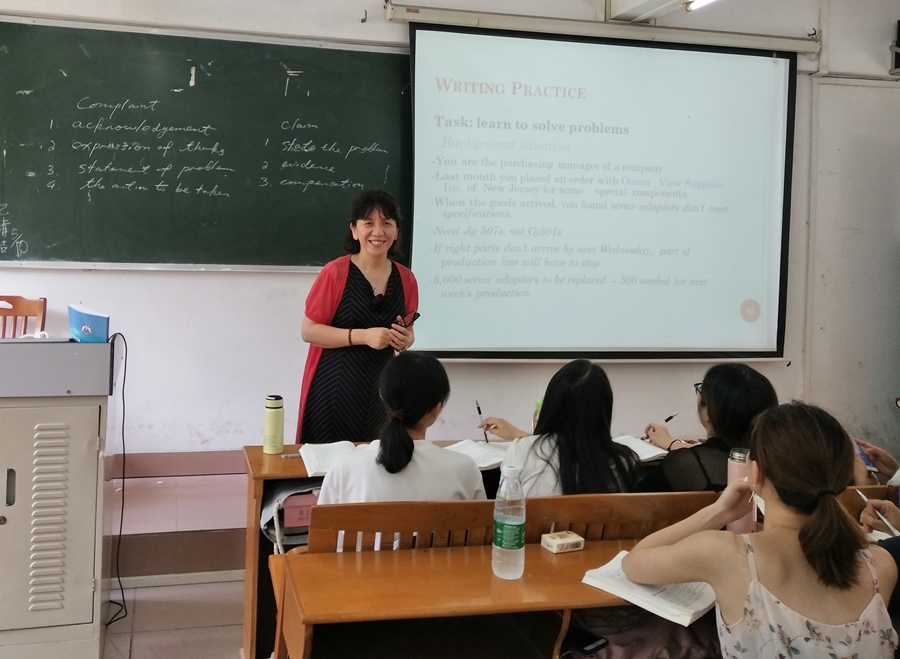 课程主讲教师是商务英语专业丁怡老师,该节课主要内容是商务英语函电中投诉函(Complaint Letter)的写作和回复。首先讲解投诉函写作的基本内容和写作要求,然后举出具体的案例供学生讨论,最后提供具体的业务场景,学生当堂以小组的形式写一份投诉函,老师进行点评。教态自然,全英授课,课件清楚,教学指令清楚,承接顺畅,时间控制恰到好处,体现了一位老教师良好的教学设计能力和课堂把控能力。课后,全体听课教师在三教102室进行了研讨会议。教师们按照“复现、评价、重构”三个阶段进行评课。一致认为该公开课教学环节完整,教师对每个环节的时间把握相当准确,案例的选取也非常合理,教师们也探讨了该课程的教学改革措施,针对“先写-后评-再案例-后复写”模式进行了热烈的讨论,从学生角度反思如何更有效进行写作输出。