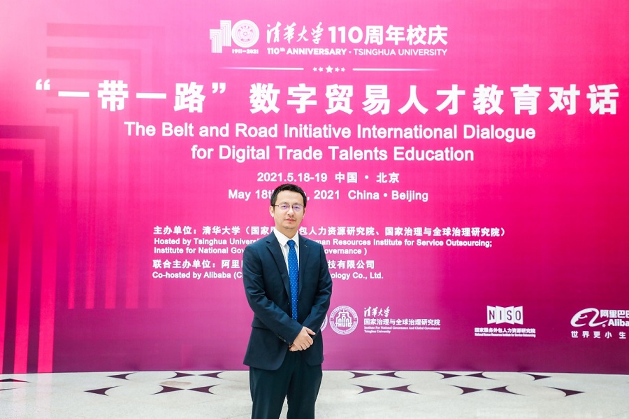 2021年5月18日-19日,清华大学国家服务外包人力资源研究院、国家治理与全球治理研究院,联合阿里巴巴(中国)教育科技有限公司,在清华大学共同主办“清华大学110周年校庆:‘一带一路’数字贸易人才教育对话”活动,来自上合、东盟多个国际组织、国内外学者专家参与对话,共同研讨在“一带一路”倡议和互联网技术发展的两大背景下,随着跨境电商迅猛发展而日益凸显的国际或地区人力资源亟需问题,以及国际化、复合型数字贸易人才标准体系、培养内容及青年就业创业问题。会上提出“‘一带一路’数字贸易人才教育国际合作五点倡议”,发布了国内首个经过教育部认证的国际跨境电商人才标准--《跨境电商B2B数据运营职业技能标准》。600余所院校、近万家企业线上参与,外国语学院副院长袁鑫代表我校受邀参加线下论坛,并做发言,介绍外国语学院跨境电商人才培养的经验。