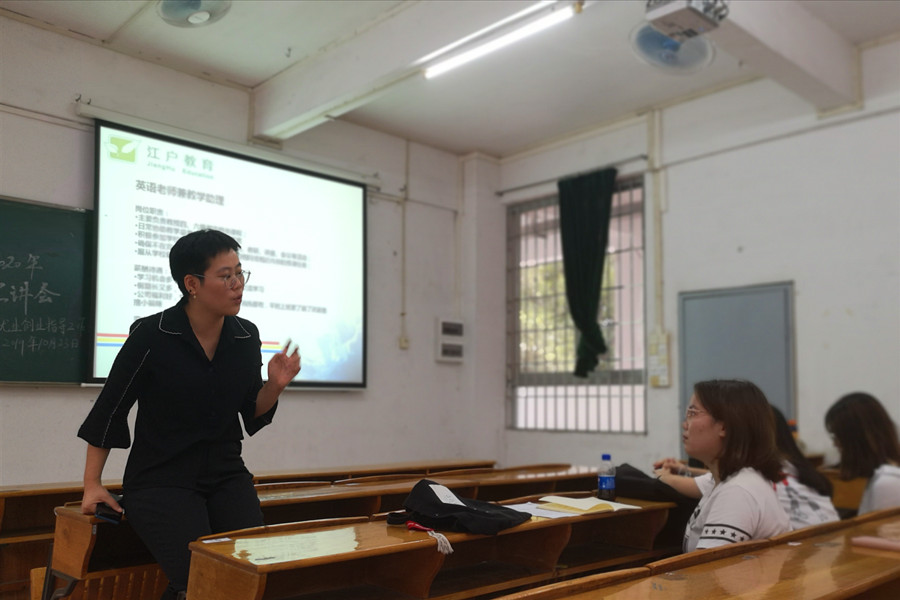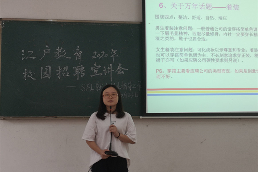 为深入贯彻落实“不忘初心、牢记使命”主题教育,做好2020届毕业生就业创业工作,10月23日下午,我院就业创业指导工作坊诚邀江户教育前来三教106开展2020年校园招聘宣讲会。江户教育校长安娜、人力资源专员梁雅瑜、毕业班辅导员戴玮、郑灿玲和部分日语、英语、德语专业的毕业班学生参加了宣讲会。