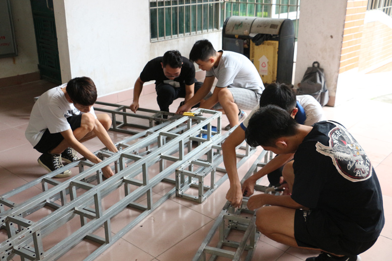 学生志愿者在安装宣传架