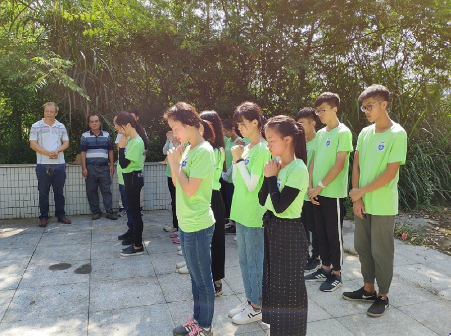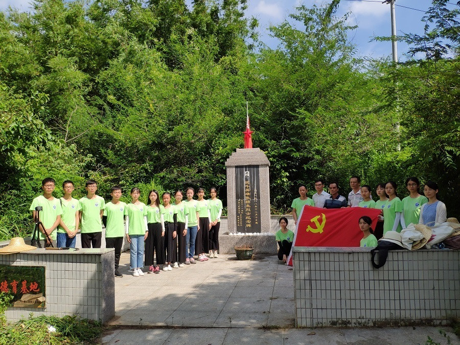 为进一步深入学习贯彻学习十九大的内涵,重温中国革命波澜壮阔的历史,引导当代青年深刻认识和理解中国革命建设过程中的伟大精神,激励大学生铭记历史,增强爱国情感,自觉践行社会主义核心价值观,外国语学院阳光展翅实践团在指导老师刘万里的带领下于7月19日前往惠州市博罗县观音阁镇南坑村烈士陵园缅怀战斗英雄张桥生烈士,一同前行的还有观音阁镇扶贫办主任杨家欢、农业办副主任徐冰。