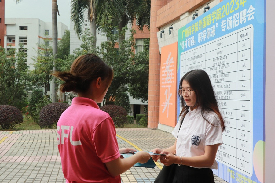 3月23日下午2点,外国语学院在第一教学楼一楼架空层举办以“怀才可遇,职等你来”为主题的广州商学院外国语学院2023年毕业生校园专场招聘会。此次招聘会联合13家公司参与,主要面向外国语学院2023届、2024届毕业生。外国语学院党总支书记徐超及各年级辅导员莅临现场。