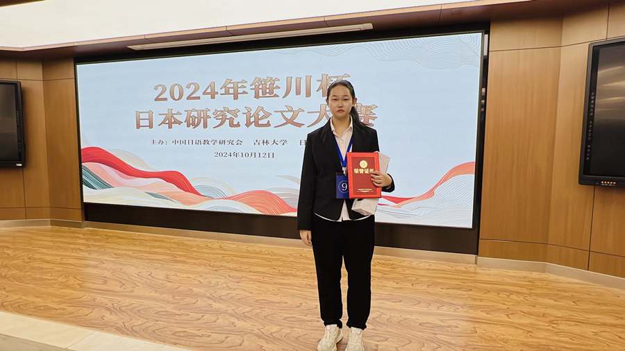 10月13日,第七届“笹川杯”日本研究论文大奖赛在吉林大学圆满落下帷幕,外国语学院21级日语专业邱敬雨同学在此次大赛中脱颖而出,斩获三等奖,成为唯一闯进决赛且获奖的民办高校学生。此外,我院学生李莉雅、黎淑慧、何彬祥、胡锐、赖永登、李安、廖娜等7位同学获得优秀奖。我院刘小珊教授荣获“论文优秀指导老师”称号。
