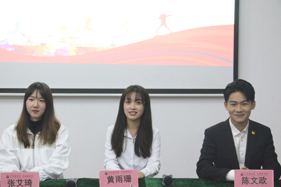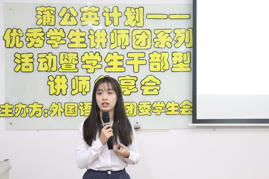 为发挥广商学子榜样引领作用,激励和带领更多学子成为新时代“四有”青年。我院团委学生会于12月9日晚19:00在三教106开展了外国语学院“蒲公英计划”——优秀学生讲师团系列活动暨学生干部型分享会。出席本次大会的嘉宾有:外国语学院学生会指导老师及19级辅导员伍思颖,优秀学生讲师德语1703班黄雨珊、德语1702班陈文政及日语1801班张艾琦。