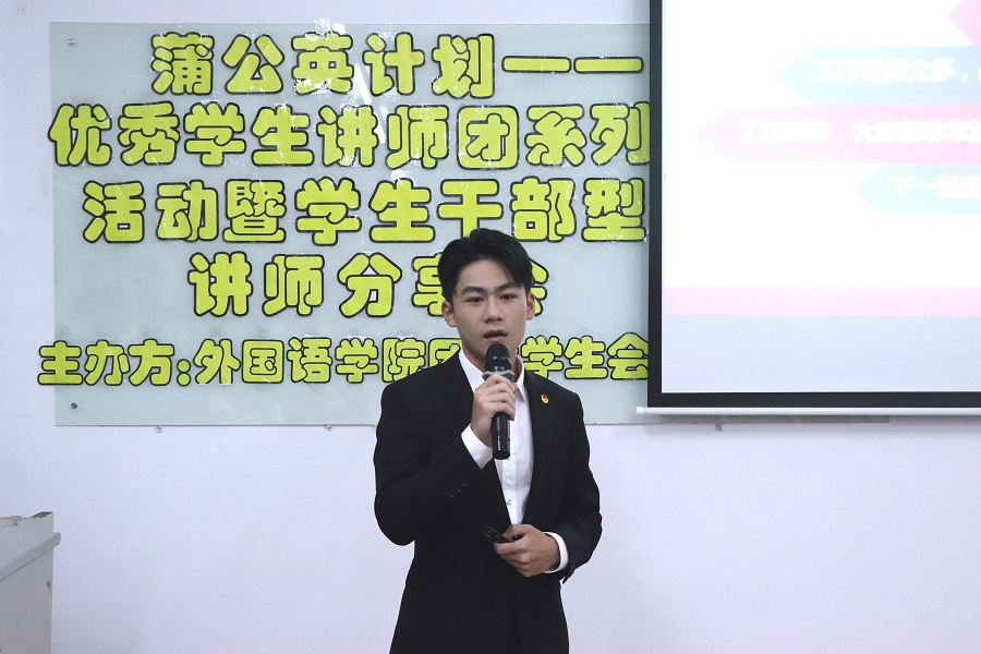 紧接着,陈文政从“疑惑与思考”和“体验与收获”两个角度向我们分享。他向同学们展示了自己在生活中的不同面貌,解答了学生干部中最常见的四个问题;希望同学们能自觉提升自己的抗压、学习及团队协作能力,在工作中收获到真挚的友谊。