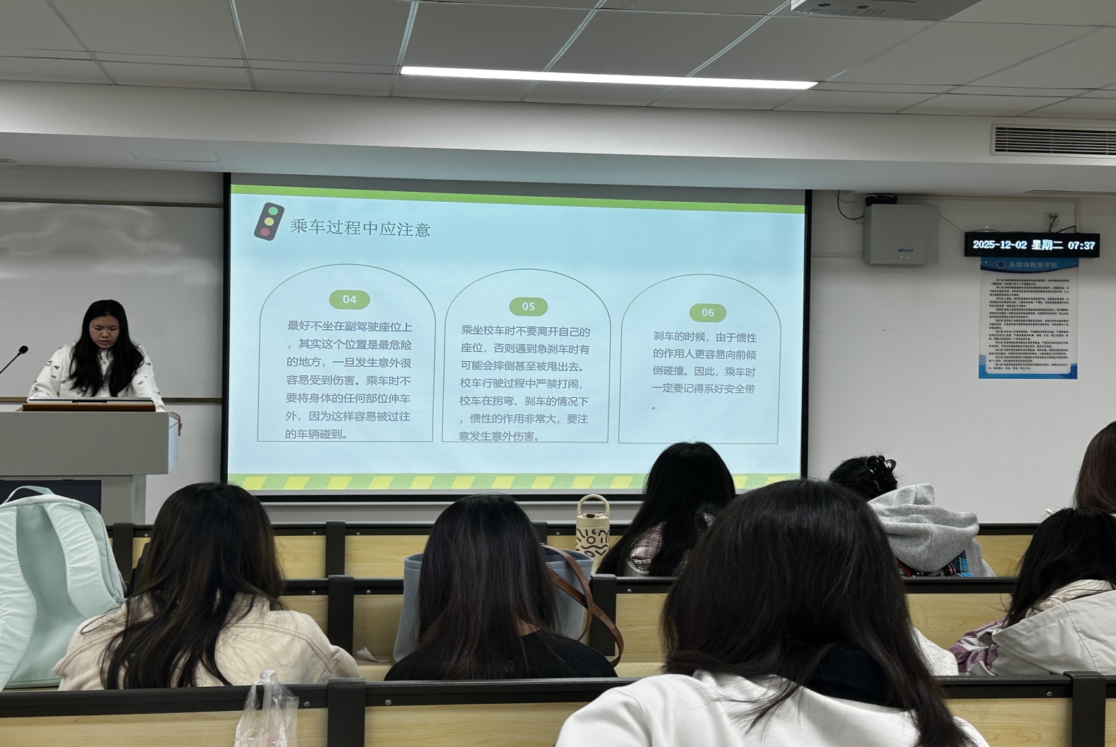 为提高同学们的交通安全意识,帮助同学们进一步了解交通安全相关知识,懂得交通安全的重要性,外国语学院2025级各专业开展了交通安全分享会。本次分享会全方位地介绍了交通安全知识和缺乏交通安全意识的危害性,为所有同学敲响了警钟。