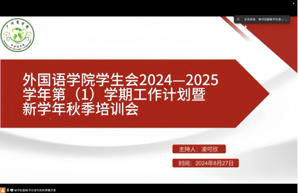 8 月 27 日晚,外国语学院学生会借助腾讯会议平台,成功举办2024-2025 学年第(1)学期工作规划暨新学年秋季培训会,学院学生会指导老师陈丽珊及全体学生会骨干参会,为新学期学生会工作开篇布局。