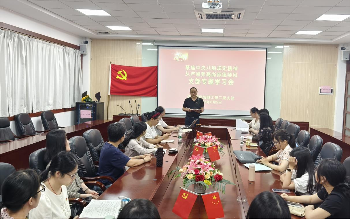 6月5日,外国语学院教工第二党支部在第二行政楼308会议室召开以“聚焦中央八项规定精神 从严涵养高尚师德师风”为主题的深入贯彻中央八项规定精神学习教育专题会,会议由支部书记唐海民主持,全体党员参加。