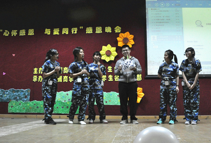 晚会在调皮有趣的歌舞《我要你快乐》中热辣辣地拉开了帷幕。首先,徐超上台致辞,他以富有意义的富翁故事教育同学们要学会感恩、养成感恩的好习惯,因为感恩的价值是超乎想象的。紧接着,温暖的《感恩广商》视频道出了往届学生对母校深深的怀念和爱,也传递了在校同学对学院祝福。随后,同学们以一系列形式丰富节目表达了对学校深深的祝福。小品《独家记忆》道出了广商母校是毕业学子最珍贵的独家回忆。朗诵《学子感恩情》描述了学院十五的创新发展,表达了“今日我以广商为荣,将来广商为我骄傲”的决心;歌舞剧《你不知道的事》生动地演绎了师长和学生的深厚感情;汇集英语、日语、德语和粤语的朗诵《赋格》歌颂了校园的美、师长的亲和父母的爱;一曲《时间都去哪儿了》唱出了对父母无私奉献的含辛茹苦,歌声和小提琴的低声合奏,全场的温馨氛围渐渐地洋溢晚会现场。最后,外语系学生会干部把感恩之心寓千言万语于十指间,温馨的手语表演《相亲相爱一家人》舞出了“一朝广商人,一世广商情”感恩情怀。