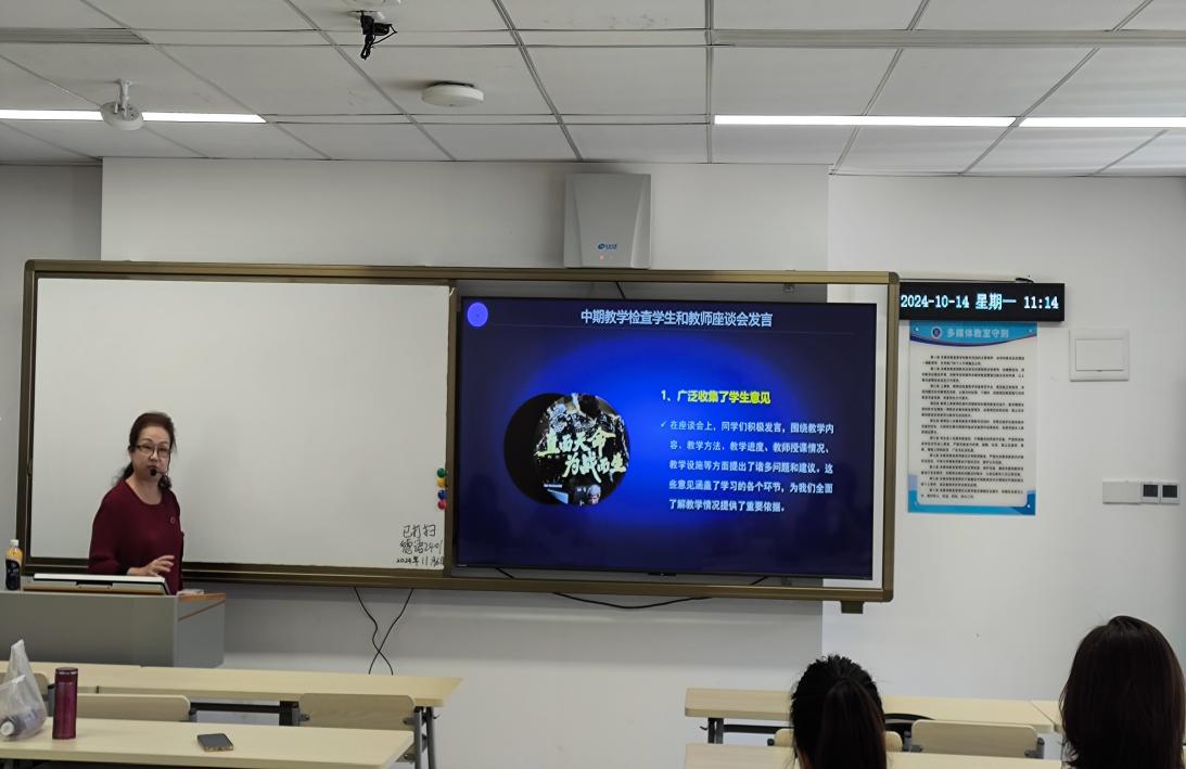 刘小珊教授总结了目前学生提出的主要问题。第一,零起点的学生在学习过程中难以跟上老师的节奏,影响了学习效果。同时,也有同学提出个别课程的进度较快,希望老师能够适当放慢进度,提高教学效率;第二,在教学方法方面,学生反馈过于教学方法过于单一。学生建议教师在教学中更多关注学生个体差异,灵活调整教学方法,适应不同水平学生的需求。同时,期望得到更多定期评估和反馈,以帮助同学们及时发现学习中的强项和不足,提升学习效率。