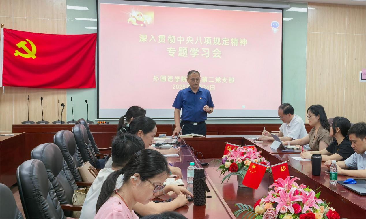 4月24日,外国语学院教工第二党支部在第二行政楼308会议室召开深入贯彻中央八项规定精神学习教育专题研讨暨警示教育会议,会议由党支部书记唐海民主持,全体党员参加。
