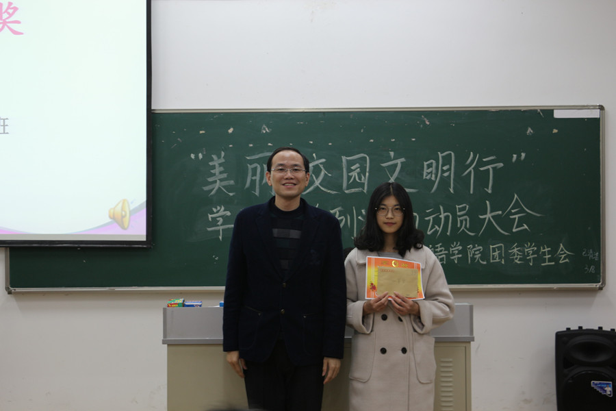 课室卫生打扫及小广告清理工作作为每年度“美丽校园文明行”系列活动的重要项目之一,我院师生上下都相当重视工作。借本次“美丽校园文明行”学雷锋月系列活动动员大会之际,会议上,特对2016-2017学年第二学期中课室卫生打扫及小广告清理活动中表现突出的班级及个人进行表彰。同时也邀请了工作表现优秀的学生干部代表分享课室卫生打扫和广告清理工作的经验。其中16级商务英语3班董敏延从展示工作安排表、分享工作安排原则等方面分享了工作体会;16级日语2班杨捷认为介绍工作目的要清晰,安排工作要合理,细小繁杂的集体活动也能凝聚班级。紧接着,由自律委员会副主任冯心如介绍本学期外国语学院学雷锋月系列活动内容。主要包括:课室卫生打扫、小广告清理、宿舍卫生检查、自行车摆放和“美丽校园文明行”宣传活动等志愿服务活动项目。从课室到宿舍,从校内到校外,从个人到团体,外国语学院学雷锋月系列志愿活动行程满满。最后,徐超为本次活动发表了动员讲话,他要求,全院师生要深刻地领会雷锋精神的核心,信念的能量,大爱的胸怀,忘我的精神和进取的锐气;全院师生要树立“广商是我家,美丽广商靠大家”的主人翁意识,携手构建和谐校园,美丽花园和幸福家园。全院师生在最美的青春里努力奋斗,勤于学习,乐于钻研,勇于担当,热于奉献,实现个人梦,青春梦,中国梦。