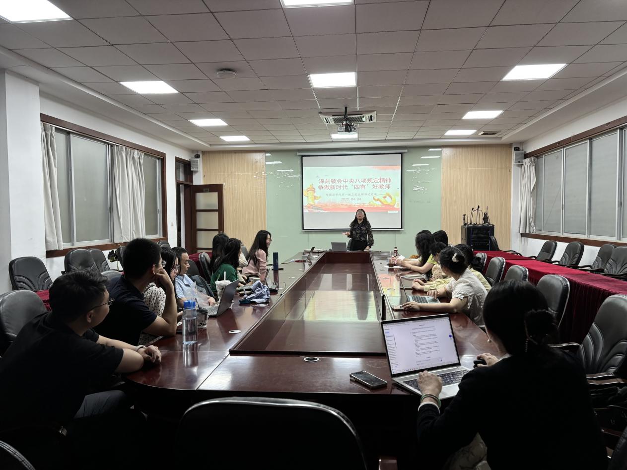 为推进深入贯彻中央八项规定精神学习教育走深走实,4月24日,外国语学院教工第一党支部在二政108会议室开展了党支部书记讲党课活动。本次活动由党支部书记田晶晶主持,支部全体党员参加。