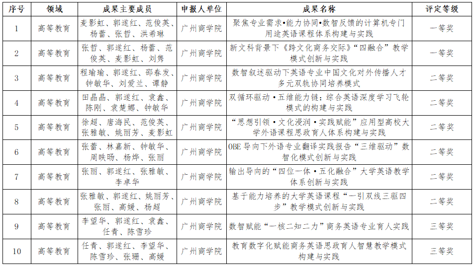 近日,广东省教育评估协会第六届教育教学成果(高等教育)质量评定结果正式公布。外国语学院凭借在高等教育教学领域的持续深耕、创新实践以及丰硕的教学成果,在众多参评单位中表现突出,一举斩获10项重要奖项,其中一等奖2项、二等奖6项、三等奖2项,充分彰显了学院在高等教育教学改革与质量提升方面的强劲实力和卓越成效。