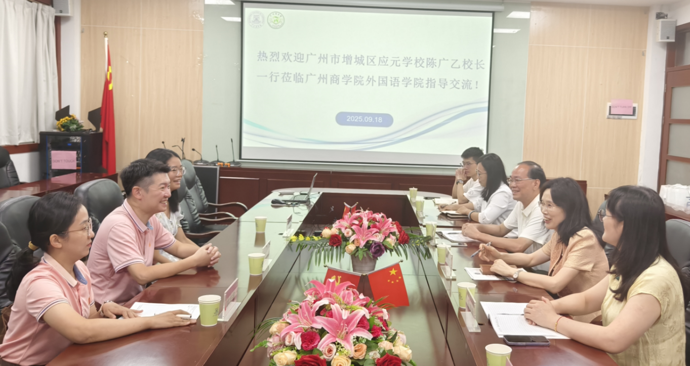 为深化校际合作、共促教育高质量发展,拓宽学生实习就业实习领域,9月18日上午,广州市增城区应元学校陈广乙校长率领学校英语学科教学骨干一行,莅临广州商学院外国语学院开展交流指导与合作洽谈活动。广州商学院外国语学院院长郭遂红、党总支书记徐超、院长助理张雅敏、英语系系主任程瑜瑜及负责校企合作相关教师、辅导员热情接待并参与洽谈。