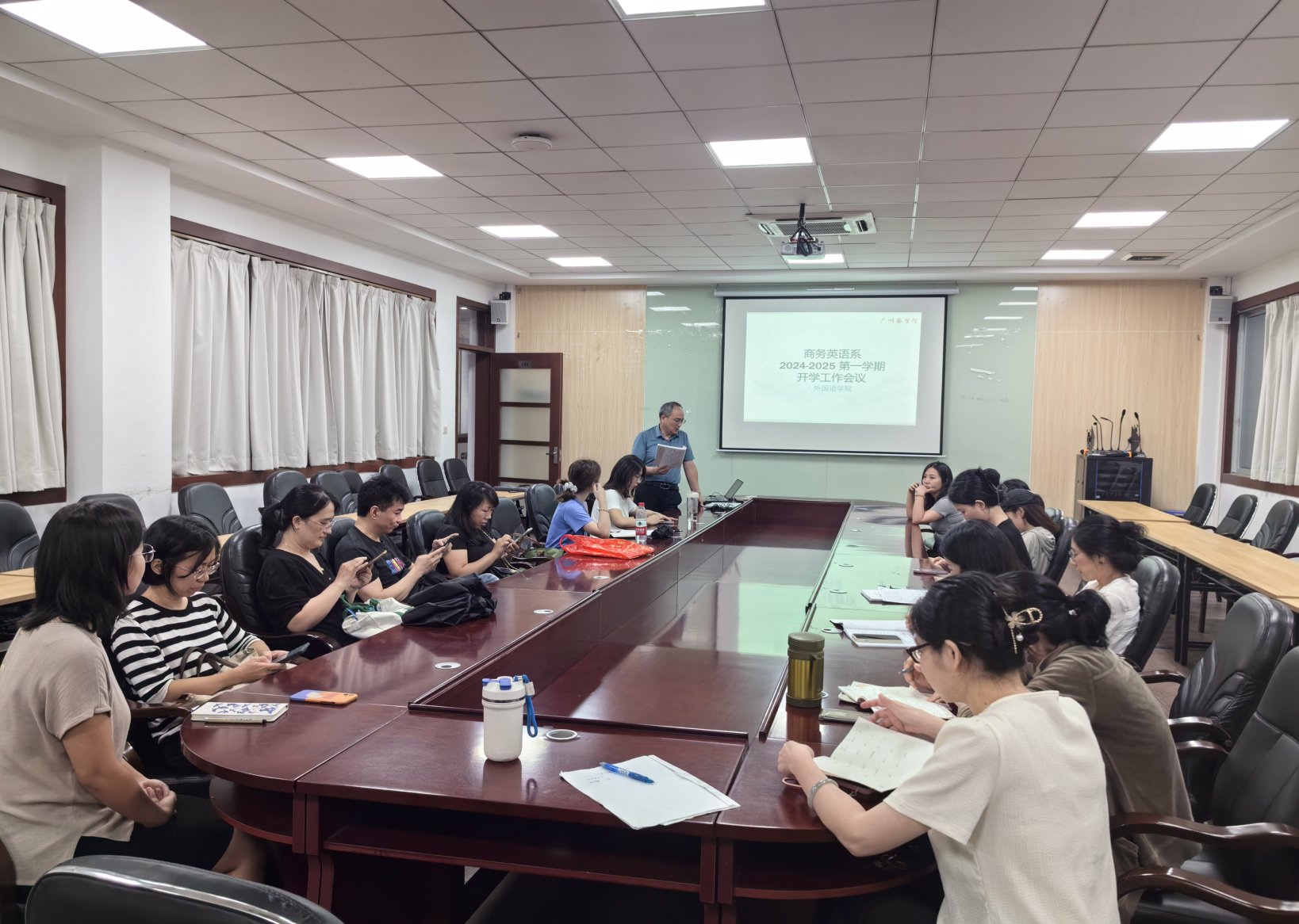 8月29日下午,商务英语系在第二行政楼108会议室召开新学期开学工作会议,会议由系主任李望华老师主持,商务英语系全体教师参加。会议围绕上学期教学反馈与总结、新学期上课准备、实习指导、论文指导、学科竞赛规划和编撰教学获奖成果手册的工作布署等方面展开。