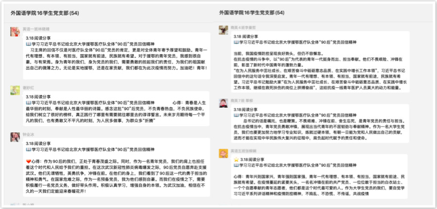 近日,外国语学院16级学生党支部的微信群里因为“一场首映式”热闹了起来。为深入学习习近平总书记给北京大学援鄂医疗队全体“90后”党员的重要回信精神,在万众一心抗击疫情的重要关头,外国语学院16级学生党支部组织了一次特别的线上主题党日活动,以手指舞的方式学习感悟习近平总书记的重要回信精神。