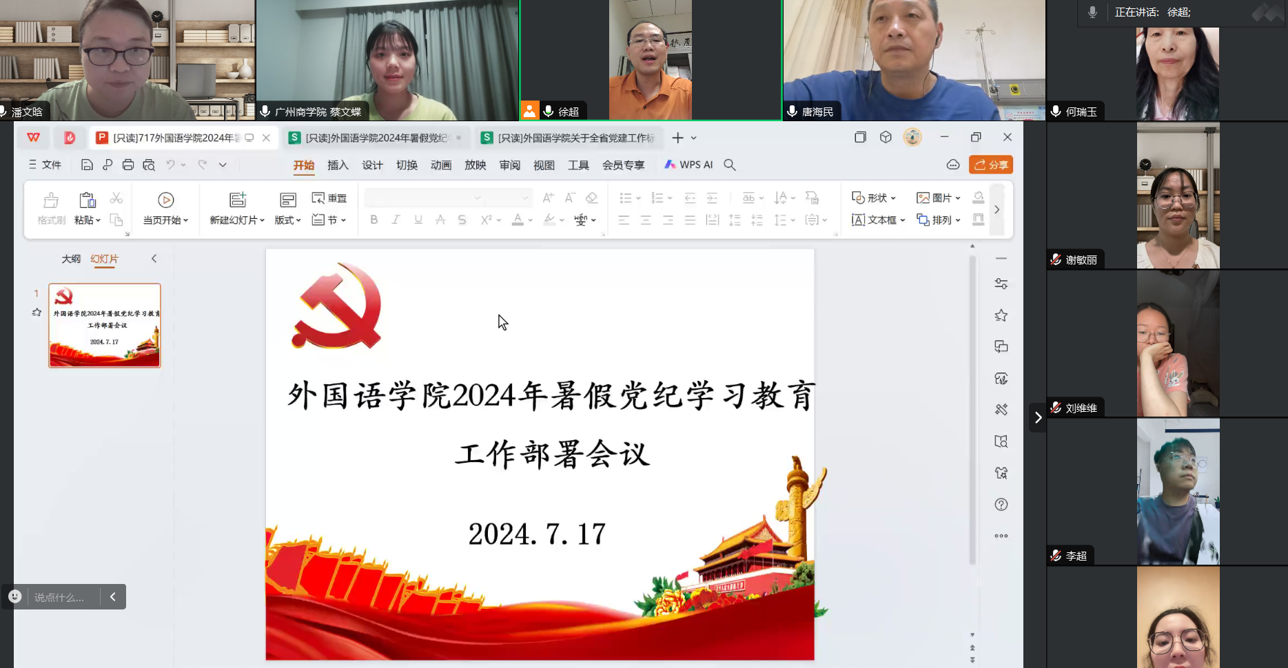 7月17日晚上,外国语学院在腾讯会议平台召开暑期党纪学习教育工作部署会。外国语学院全体党总支委员、党支部书记参加会议,学院党总支书记徐超主持会议。